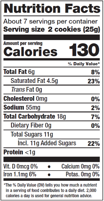 Contains: Wheat, Soy. Manufactured in a shared facility with: Peanuts, Coconut, Milk. DIET EXCHANGE Serving Size: 2 cookies, 1 starch or carbohydrates, 1 fat.