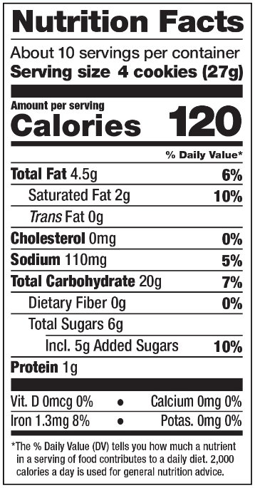 Contains: MILK, SOY, WHEAT. MANUFACTURED IN A SHARED FACILITY WITH: PEANUTS, COCONUT. DIET EXCHANGE Serving Size: 4 cookies, 1.5 starch or carbohydrate, 1 fat.