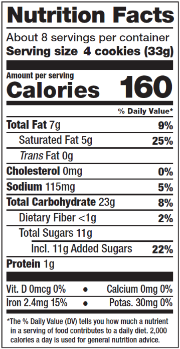 Contains: WHEAT, SOY. MANUFACTURED IN A SHARED FACILITY WITH: MILK, PEANUTS, COCONUT. DIET EXCHANGE Serving Size: 4 cookies, 1.5 starch or carbohydrate, 1.5 fat.
